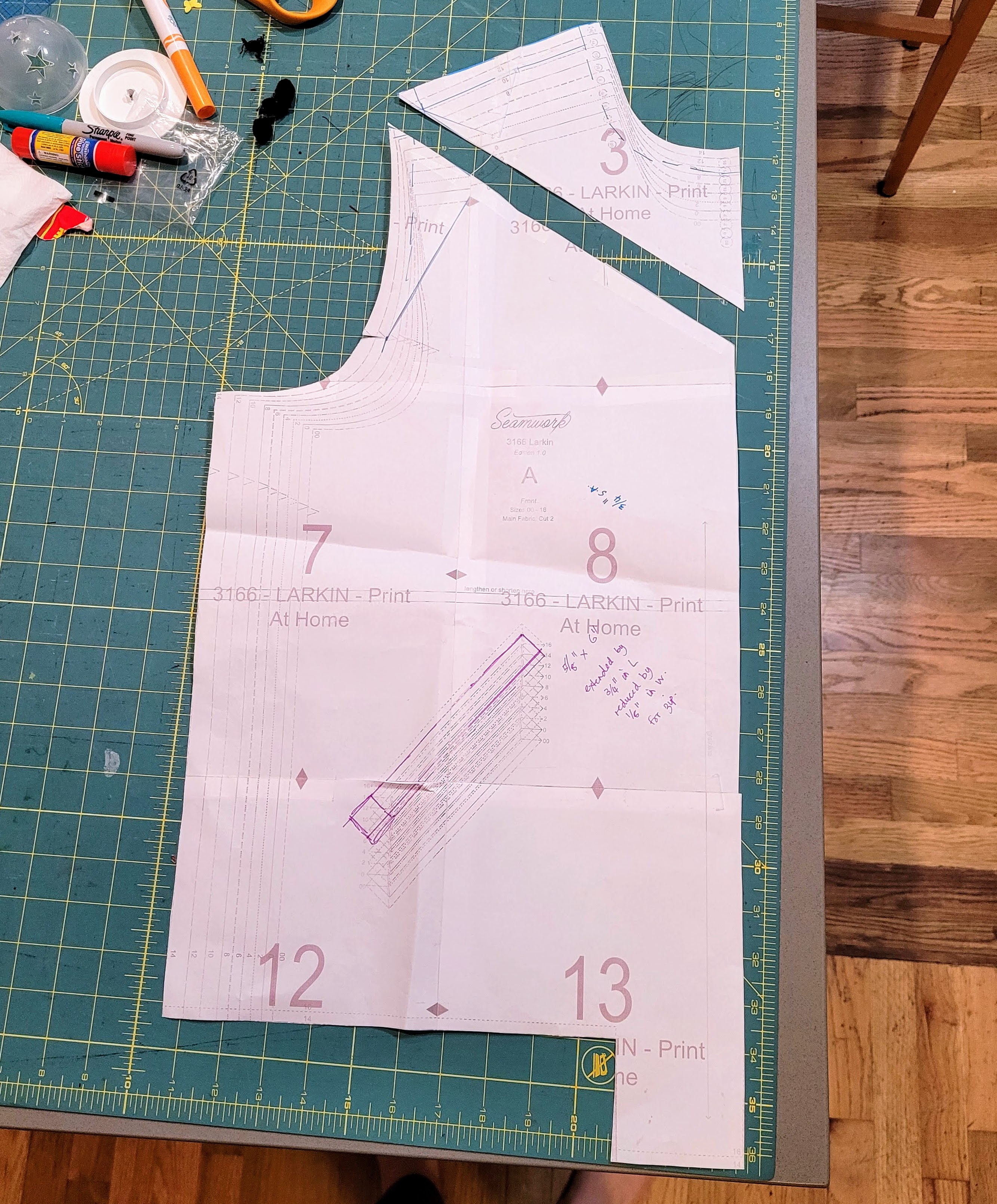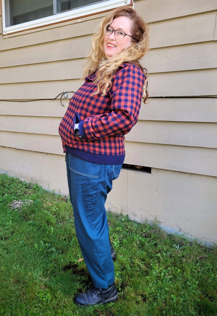 The Larkin has a relaxed fit, so I sized down one size to get a good shoulder fit and made the 14 misses. It is definitely relaxed and not oversized though, so I was glad I didn’t size down any further. If it had been a regular B cup draft, I might even have had some strain, but since Seamwork patterns are drafted for a C cup, as compared to my own D cup, I was okay. However, when I measured the pattern pieces against myself, I could see the shoulders were still quite wide, so I made a further 3/4″ narrow shoulder adjustment and probably could have gone the full inch. The 14 shoulder usually fits me pretty well on a Seamwork pattern, so my assumption is that it’s been drafted a bit longer this month so it can be adapted for all genders? Not sure, but it was certainly wider than normal.