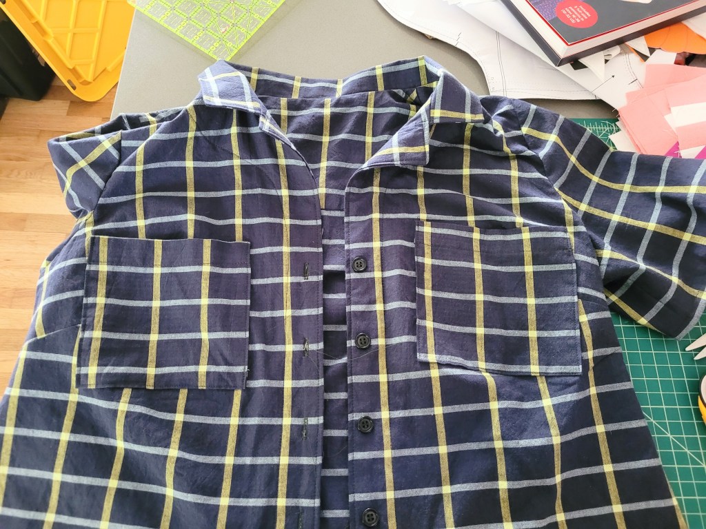 The Gilbert Top is a fairly relaxed camp collar shirt with a back yoke and an optional pocket. There are two main views offered (although lots of aforementioned hacks on Helen’s blog) and for this shirt I decided to make the short-sleeved version with the straight hem, so a mix of views A and B. I also opted to add two pockets as I thought one would look a little uneven on this view. I didn’t even attempt to pattern match the pockets as I usually have to experiment to find the ideal placement the first time I make a shirted pocket, but one of them ended up matching exactly – completely coincidentally! So now it looks as though I only made one, but there are actually two there, haha (see below for proof). In fact, I like the look of a pocket, so I don’t even always want to pattern-match them.