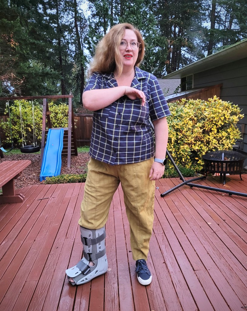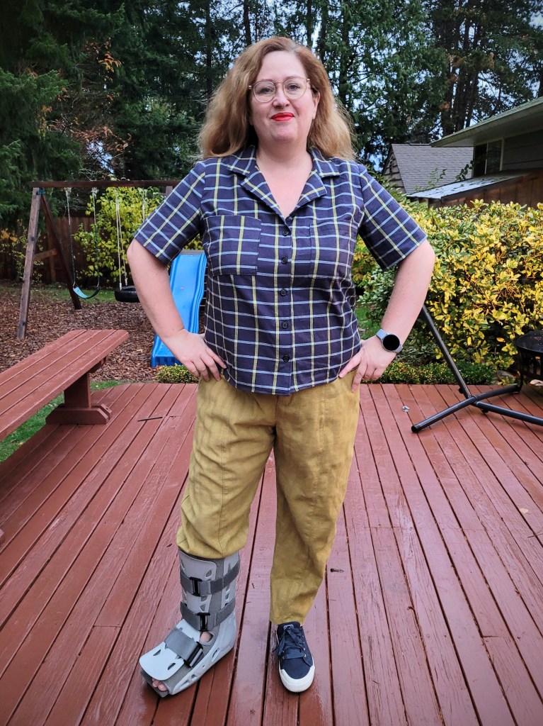 Hey folks and a happy Autumn to you! Did you have a good Halloween? We definitely did here and it was lovely to see the kiddos getting out and about almost as if it were a regular pre-Covid year. I had my own little horror story a week or so ago when I tripped in a pothole while walking my dog at night. Ouch! I may have a tiny fracture but mostly it’s just a very bad sprain and I’ll be wearing a boot for a few weeks, as you can see in some of the photos. I only had the second sleeve to sew on my new Gilbert Top, so I managed to get it finished yesterday and here are a few pics!