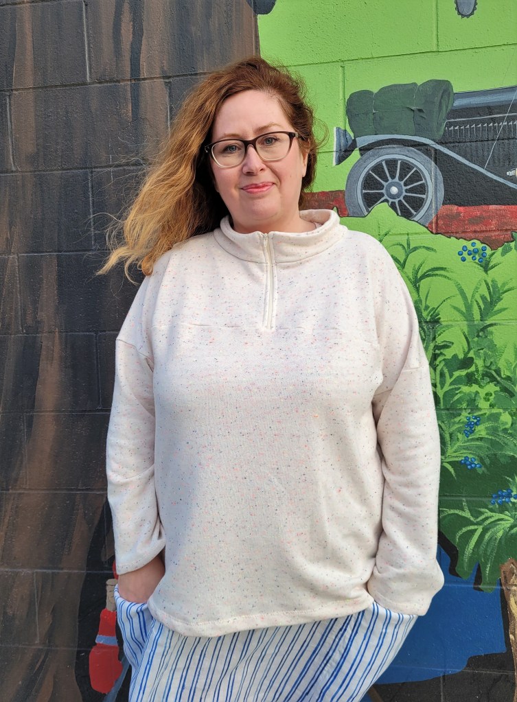 The Amari jacket is a pullover with dropped shoulders, a yoke, a stand collar and a quarter-zip. Seamwork recommend that you use knit fabrics with at least 25% stretch and that they are medium to heavyweight. You really need this so the stand collar sits up and also so that the zip can be attached properly. I used a lighter French terry for mine, and a thicker brushed merino for my mother-in-law’s pullover and you can see the difference in the stand collar (see hers further down the page). Hers is nice and upright, while mine, although still perfectly acceptable, is a little softer. I wouldn’t want to use a fabric any lighter than that. The bonus version of the pattern has a hood and drawstring, which is a nice alternative.