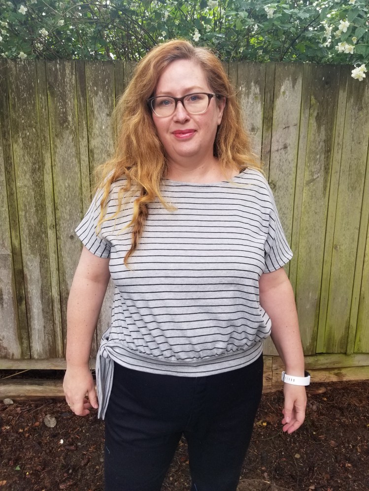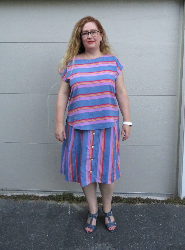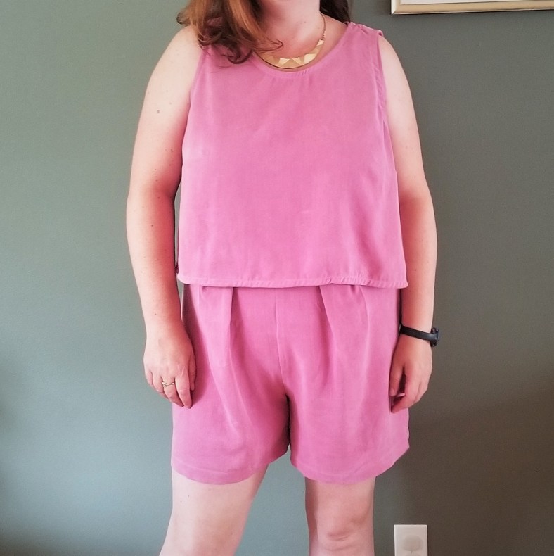 Anyway, all this preamble is really because I’m kind of lukewarm on this project too, haha! Let me say up front that I half expected to be lukewarm because of the slightly boxy shape, but I was really interested in the Seamwork Kristin top with its unusual design, and I wanted to try it out from a mechanical point of view. I gather this style was quite popular back in the sixties, and it comprises a wrap-style tank with an interesting three-armhole design. It has “bust darts, a relaxed fit, and a slightly cropped length make for a flattering fit for both misses and curvy sizes” according to Seamwork. What this means is you effectively make a front, a back and then another half-front and half-back and sew them all together. Then you wrap it around yourself and the weight, plus a snap, holds it all in place. Continue reading “New outfit: Kristin crop top and Heidi shorts from Seamwork” →