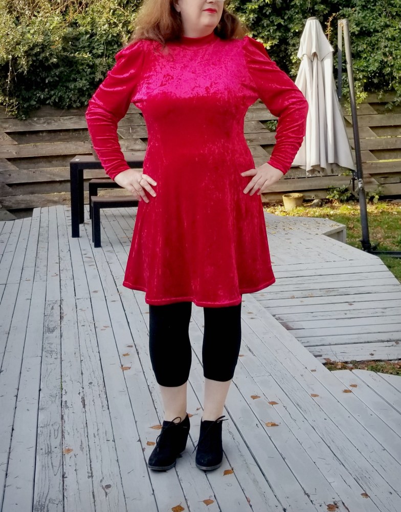 This dress came about for several reasons. Initially I happened to spot a wonderful Marc Jacobs dress in Nordstrom. I occasionally pop up to the designer floor to check out the sewing on some of the garments and get a little inspiration. I’ve never been a designer clothes wearer, but I thought the design on this $995 dress (below left) was really sharp and interesting, and the velvet was of beautiful quality. I wouldn’t have really noticed it in a picture, but in real life the dress just sort of glowed. Of course, it was also hitting those three big A/W fashion trends of red, velvet and shoulders/sleeves, which would normally put me off in all honesty, but it just so happens that I rather like red anyway, so… YES!