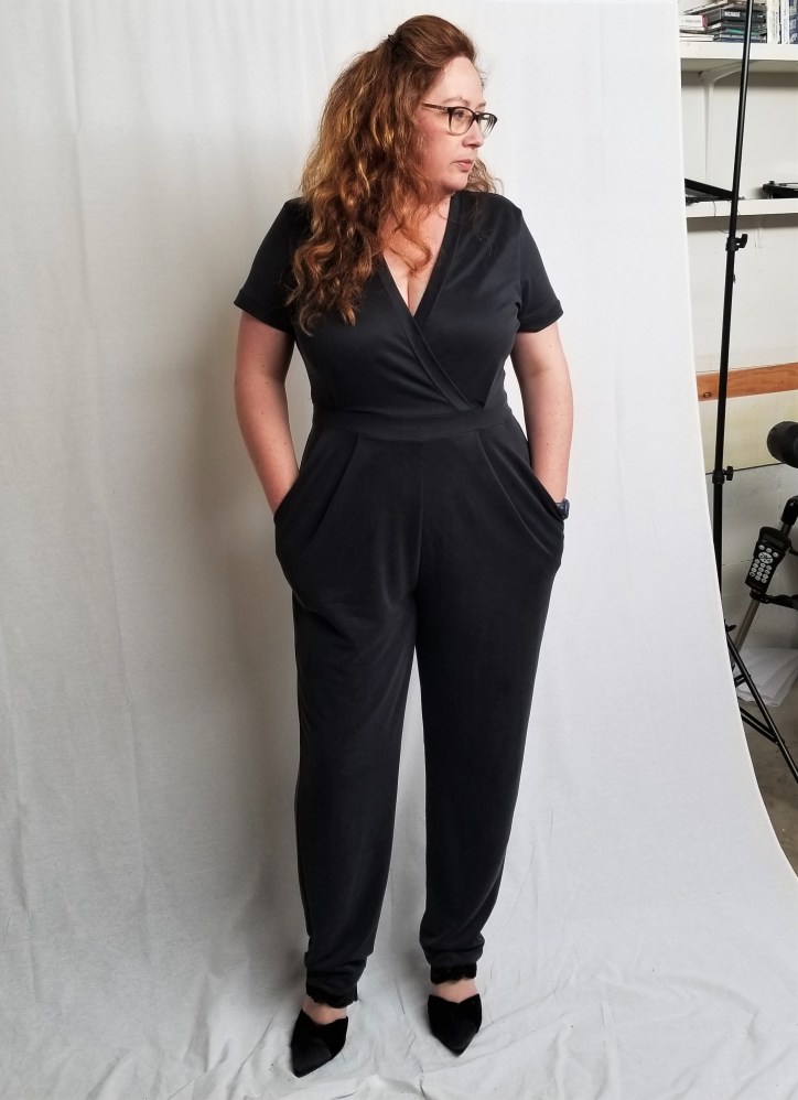 I LOVE it. Like, really love it. I’m a fairly “glass-half-full” kind of person and can see the positive in most of my projects, but it’s great when something comes along that really knocks my socks off. This jumpsuit is exactly what I hoped it might be and that doesn’t happen too often. Great drafting and just so me. Comfortable to wear, with modern clean lines, but also some structure thanks to the sleeves and pleats. Yes, I really do love it. Of course, black fabric is hard to photograph, but hopefully you can see the detail okay – I tried a few different locations. I also wore it with both heels and trainers – and let’s face it, I’m much more likely to be sporting the latter with a cardie over the top. It’s a versatile garment!